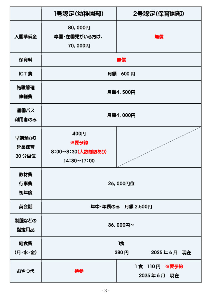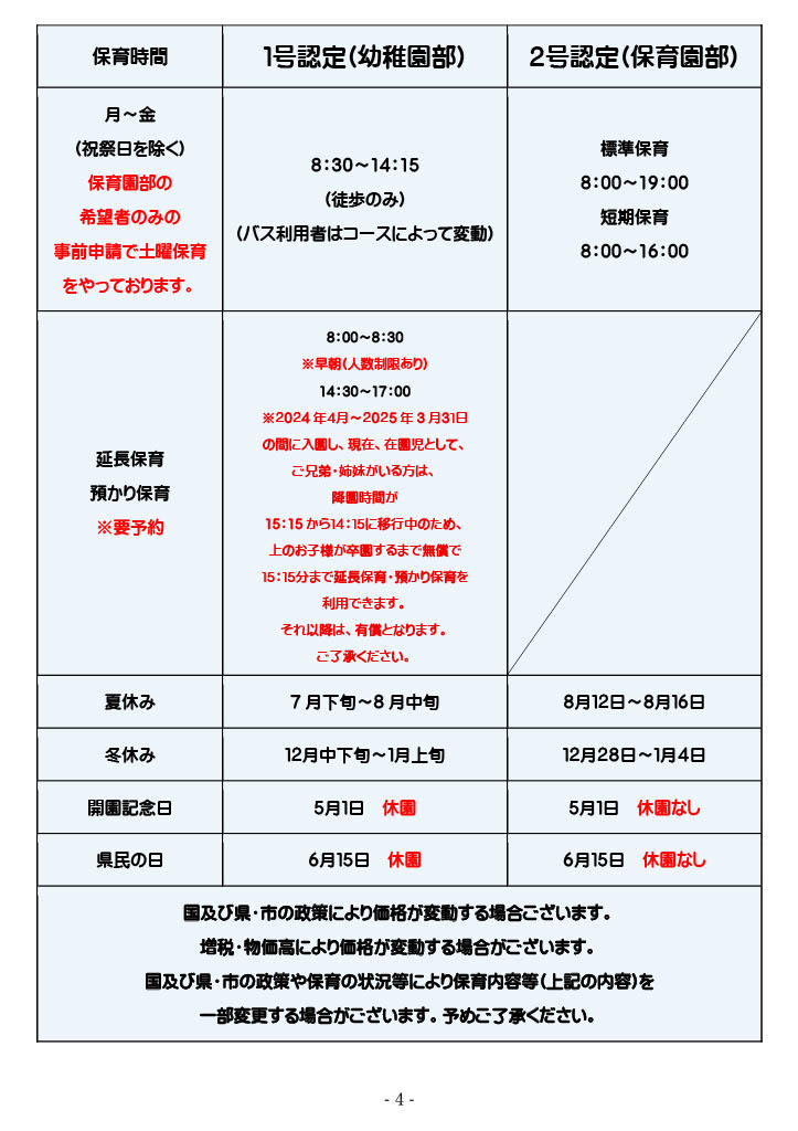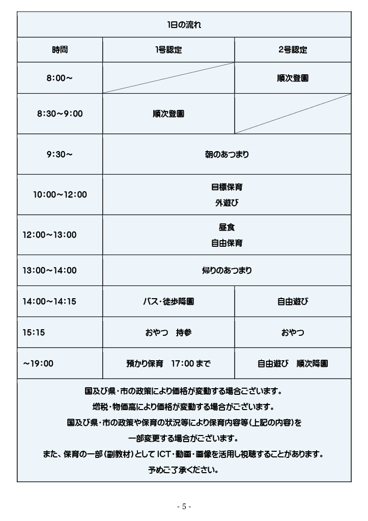 国及び県・市の政策により価格が変動する場合ございます。 増税・物価高により価格が変動する場合がございます。 国及び県・市の政策や保育の状況等により保育内容等(上記の内容)を 一部変更する場合がございます。 また、保育の一部(副教材)としてICT・動画・画像を活用し視聴することがあります。 |